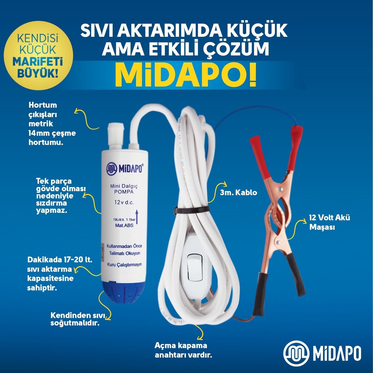 12 Volt Midapo Bidon Tarzı Mazot-Sıvı Transfer Pompası, sunduğu yüksek kalite ve performansla mazot veya diğer sıvıları hızlı ve güvenli bir şekilde aktarmanıza yardımcı olur. Bu pompayı araçlarınızda, tarım araçlarınızda, tekne veya traktörlerinizde kullanabilirsiniz. Sahip olduğu 12 volt motor gücü kaynağı sayesinde dakikada 16 litre aktarma hızına sahiptir,