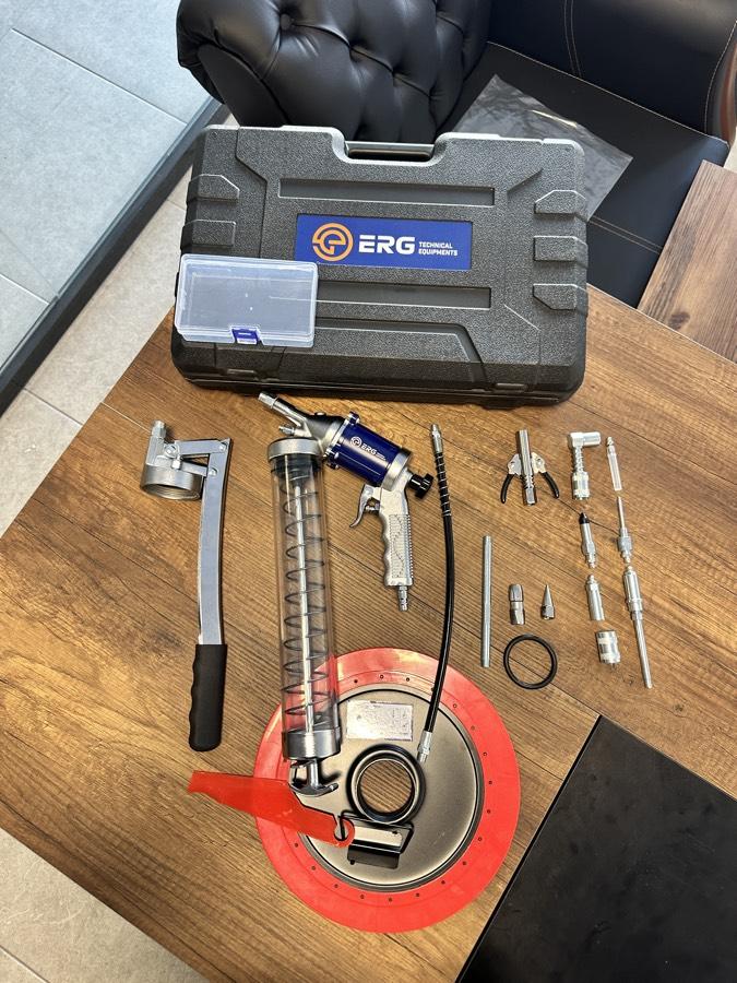 ERG Technical kalitesiyle profesyonel kullanım için tasarlanmış 600 CC havalı şeffaf gres pompası full set, güçlü yapısı ve zengin aparat içeriği ile tüm yağlama işlerinizi kolaylaştırır.