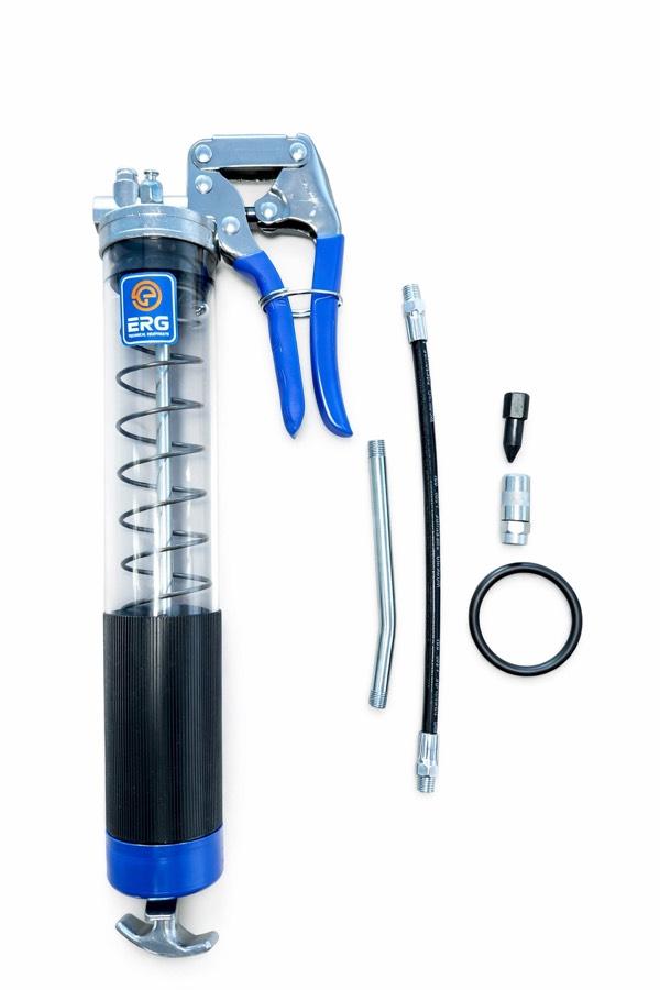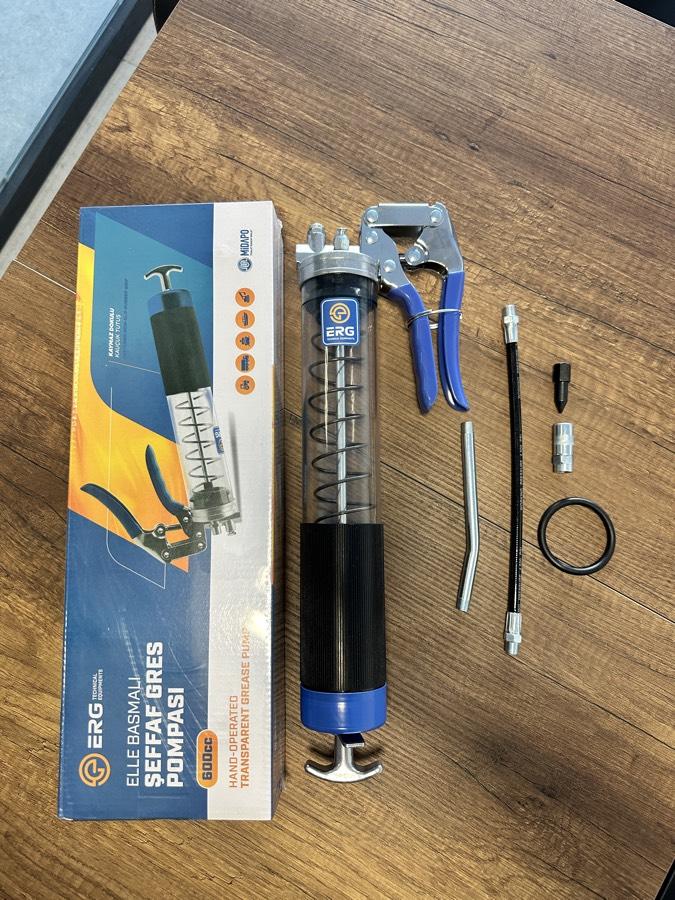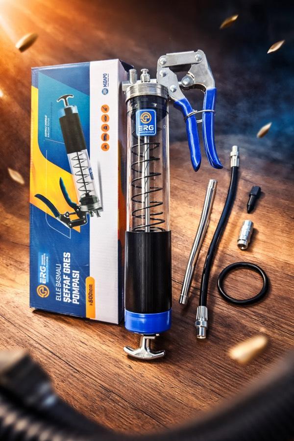 ERG Şeffaf 600 CC El Basmalı Gres Pompası, makine, ekipman ve araçların düzenli yağlanması için özel olarak tasarlanmış, dayanıklı ve pratik bir üründür. Şeffaf gövde yapısı sayesinde içerisindeki gres miktarını kolayca takip edebilir, kesintisiz ve kontrollü kullanım sağlayabilirsiniz. Güçlü basınç mekanizması ile gres yağı noktasal ve etkili şekilde iletir. Tarım makineleri, iş makineleri, traktörler ve sanayi ekipmanlarında profesyonel kullanım için idealdir.